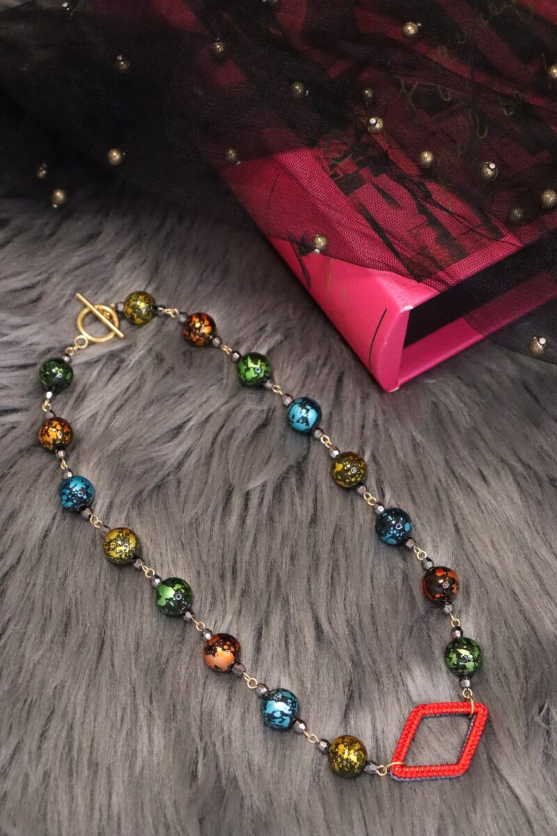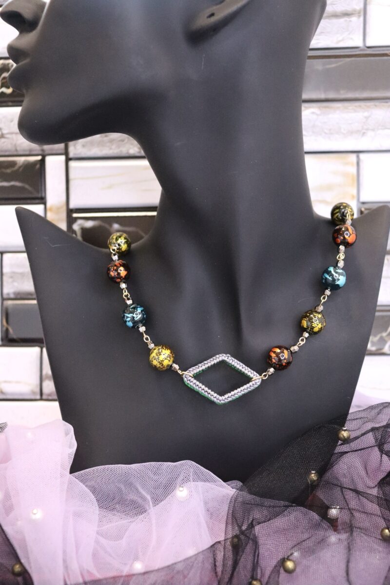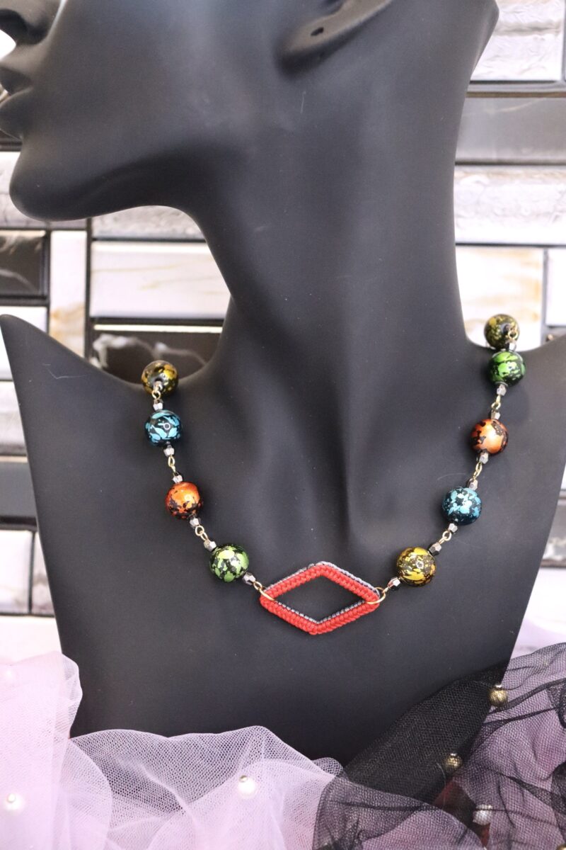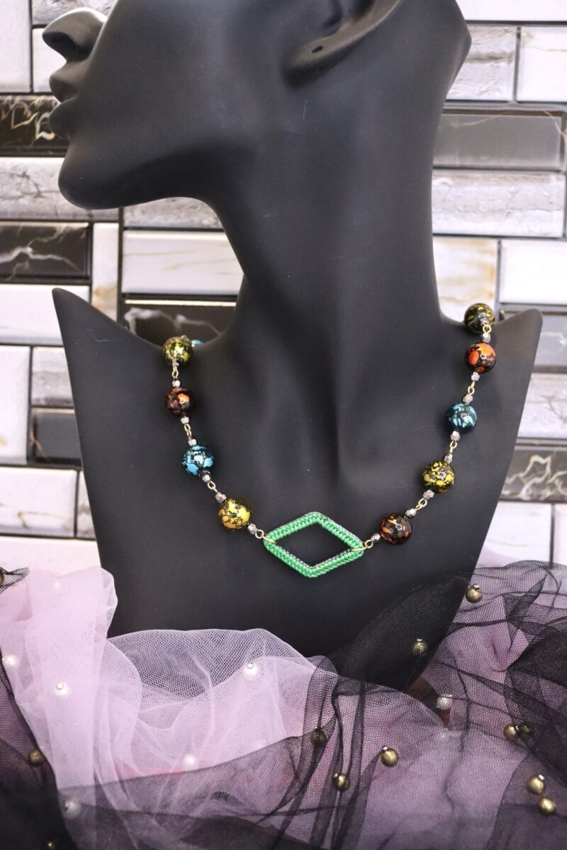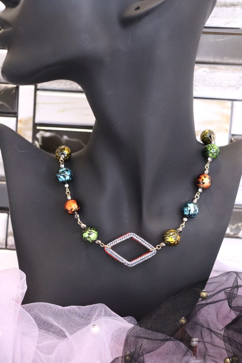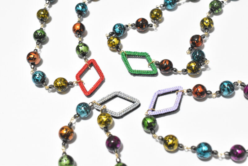 - ひし形の手編みフープがポイントとなっているネックレス。手編みフープはリバーシブルカラーとなっており、その日のコーデに合わせてお色味を変えられます。