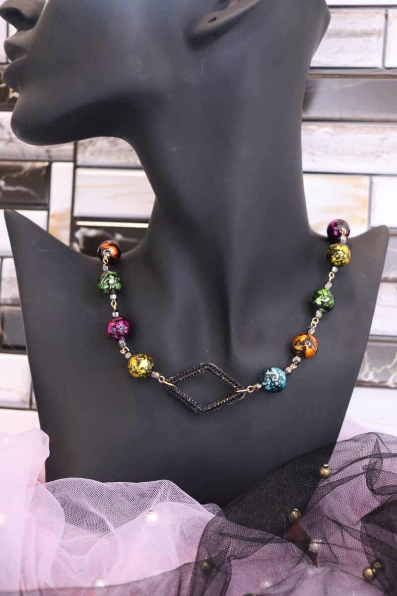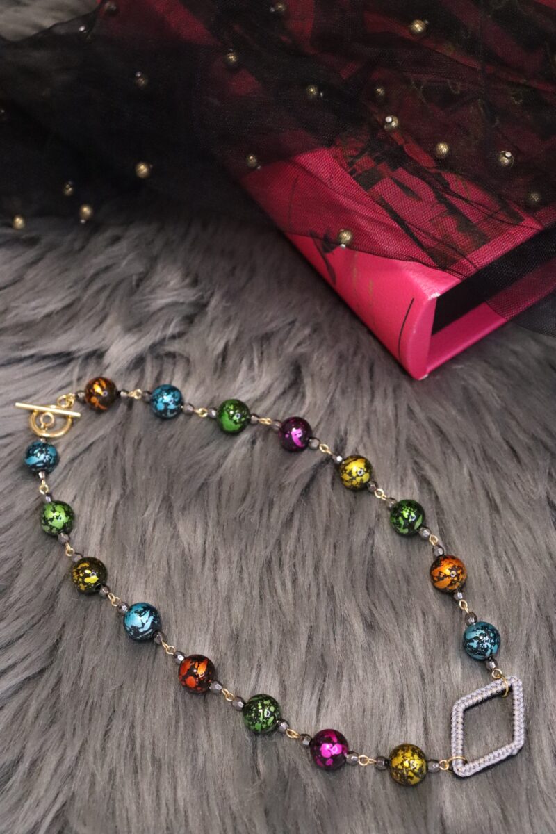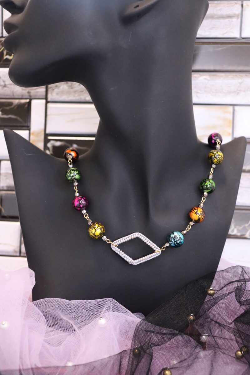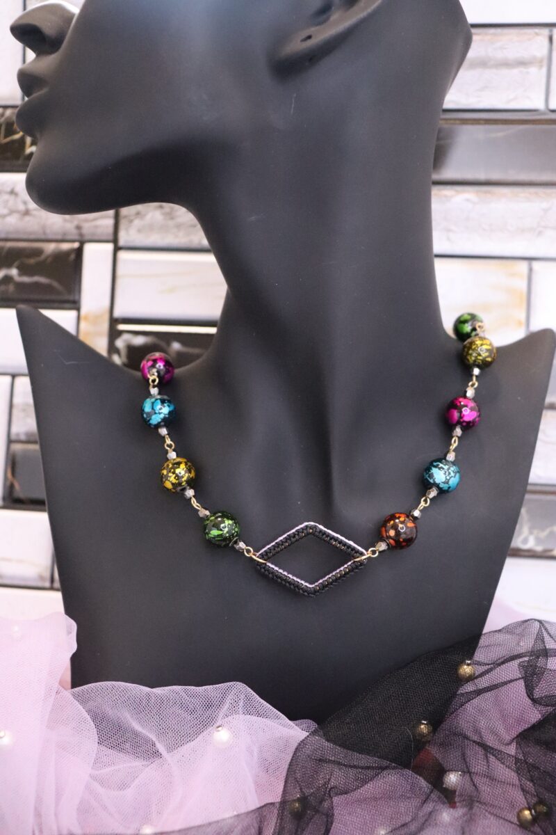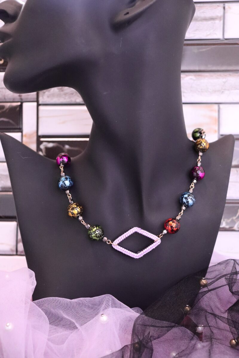 - ひし形の手編みフープがポイントとなっているネックレス。手編みフープはリバーシブルカラーとなっており、その日のコーデに合わせてお色味を変えられます。
