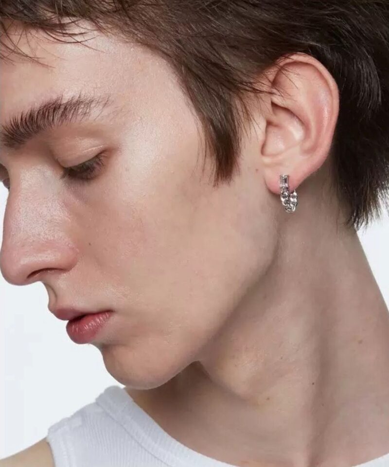 - 存在感のあるチェーンリンクに、上品に輝くバゲットカットストーンを組み合わせたピアス。